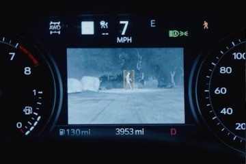 Available Night Vision can help you see beyond your headlamps by displaying a thermal heat image that highlights and alerts you to detected pedestrians or large animals directly ahead of you.